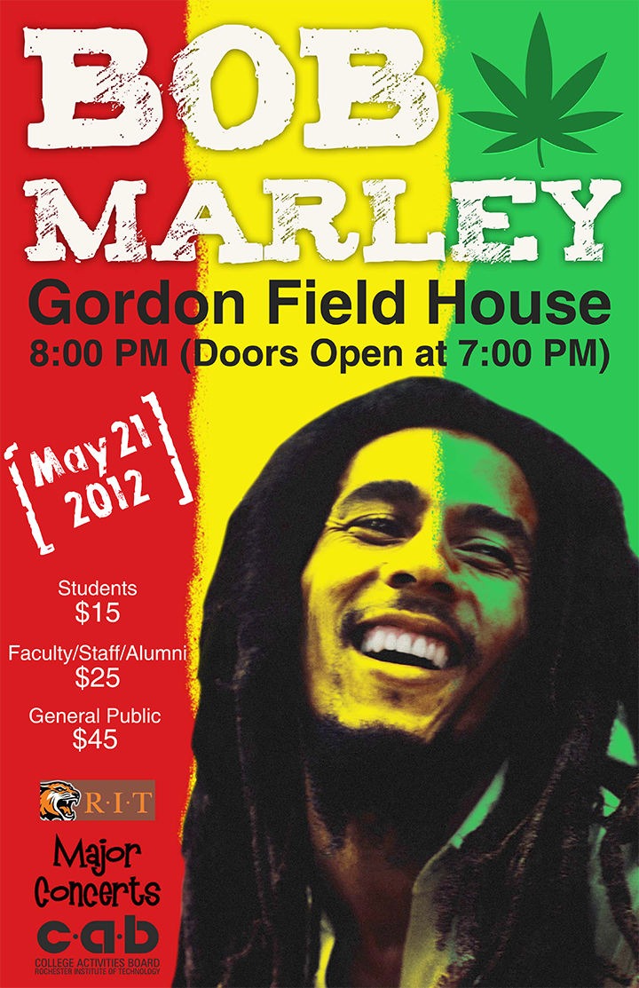 In a digital/print imaging class, I was asked to create an 11 x 15 poster to advertise the musical artist of my choice who would appear at RIT. I chose the late Bob Marley. Using a famous picture of the man, I used various tools to produce a large-format image which was printed out and displayed at RIT.